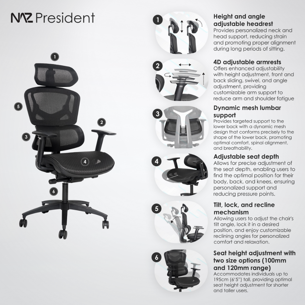 Discover the epitome of workplace comfort with our flagship office chair, the President Model. This premium seating solution offers unparalleled ergonomic excellence. Explore its comprehensive features below for an elevated office experience.